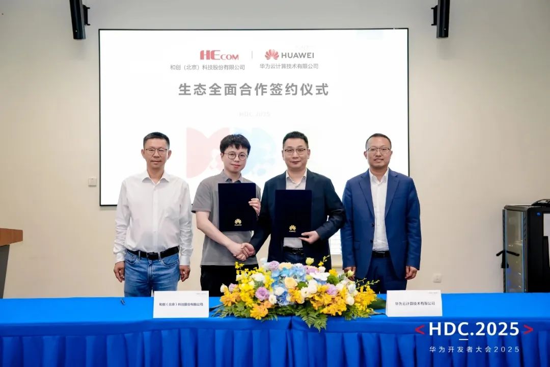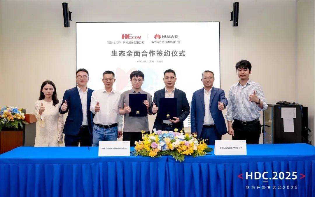 在2025華為開發(fā)者大會期間,和創(chuàng)(北京)科技股份有限公司(以下簡稱“和創(chuàng)科技”)與華為云計算技術(shù)有限公司(以下簡稱“華為云”)簽署生態(tài)全面合作協(xié)議,雙方將在聯(lián)合解決方案構(gòu)建、AI應(yīng)用開發(fā)及行業(yè)大模型共創(chuàng)等領(lǐng)域展開全方位合作,共同推動新一代人工智能產(chǎn)品在工程行業(yè)的應(yīng)用落地。在和創(chuàng)科技CEO劉學臣、華為云生態(tài)發(fā)展與運營部部長陶志強的共同見證下,和創(chuàng)科技副總裁王禹、華為云北京云生態(tài)發(fā)展與運營部部長代表雙方完成簽約。