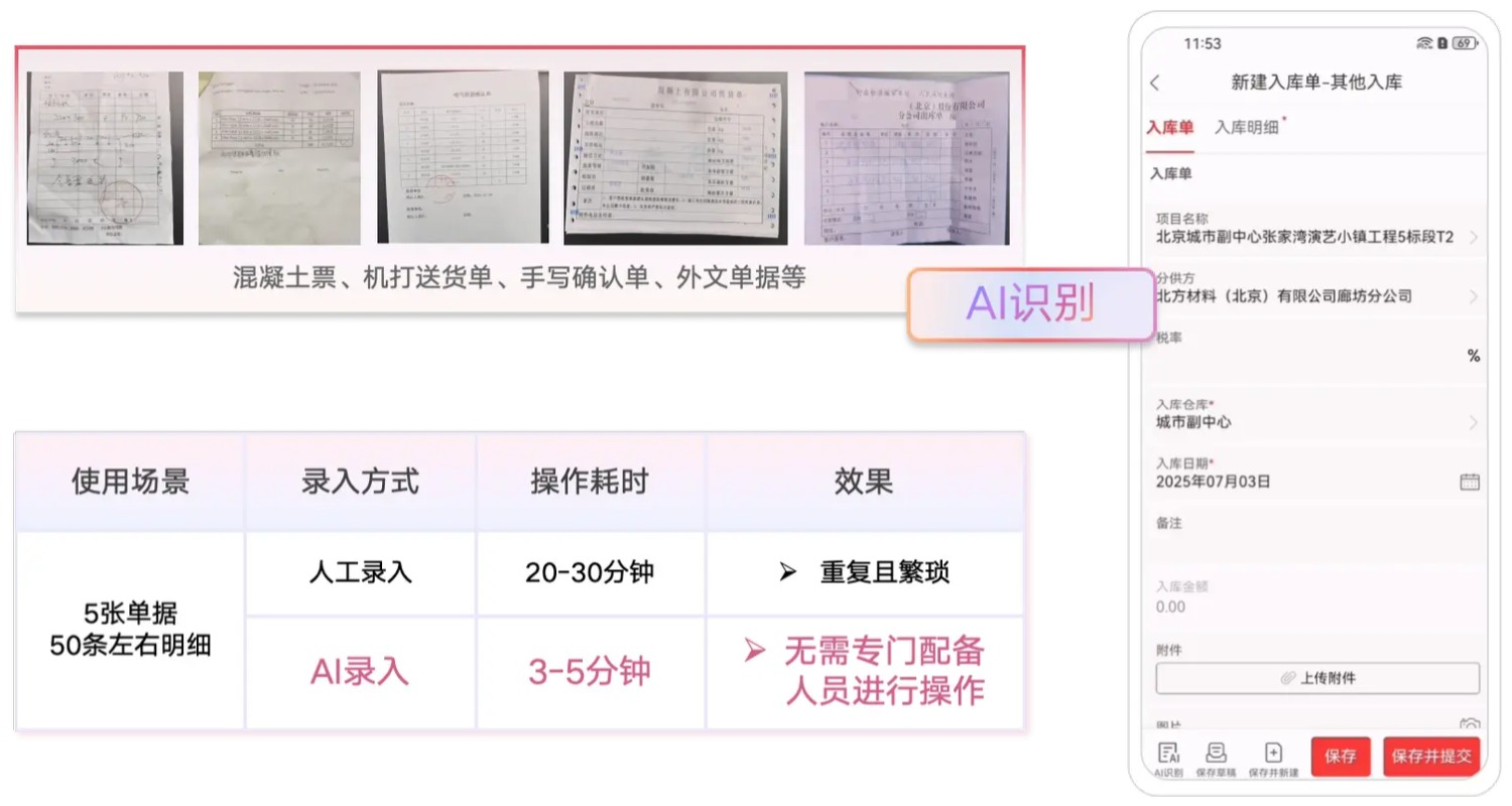 AI錄單助手能夠自動從入庫單中識別出材料的名稱、規格、數量等信息,并進行數據回填。系統還會在數據錄入時進行實時成本預警,確保企業在采購環節能夠精確把控成本。通過AI的輔助,入庫單的錄入時長縮短了80%,而成本控制的準確性提高了20%,極大提高了企業的資金使用效率。