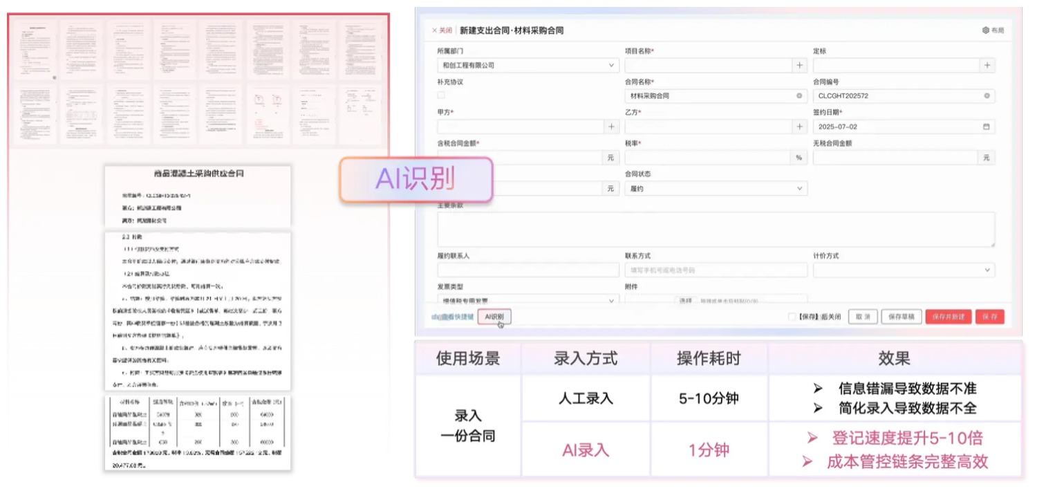 智能識別并錄入合約條款、付款比例、付款條件等關鍵信息,為成本控制提供更詳實依據。
