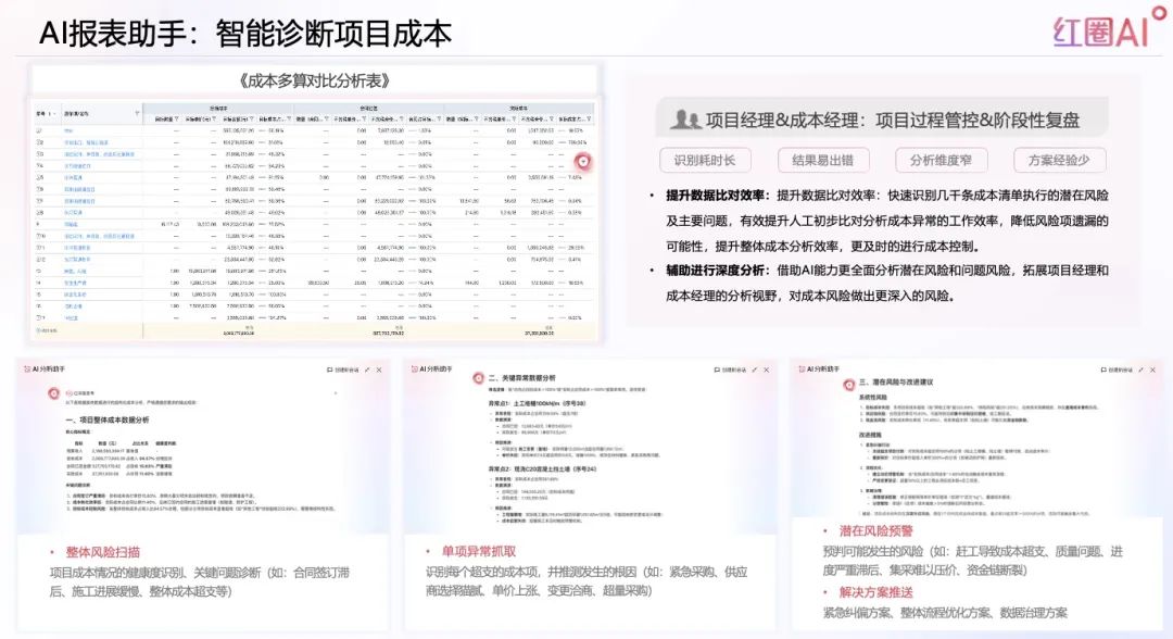 深度分析潛在風險:結合紅圈系統的全流程數據,AI報表助手不僅能識別項目的健康狀況,還能深入分析如合同滯后、施工延誤等潛在風險,為項目經理提供更加全面的成本管控視角。