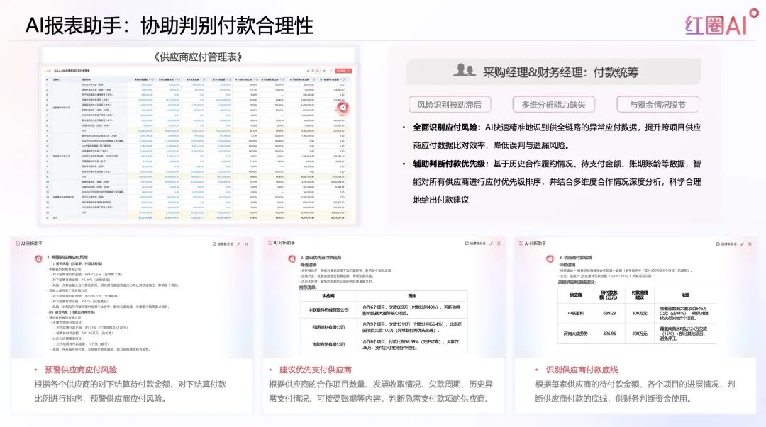 在財務管理和采購管理方面,紅圈系統通過集成AI報表助手,幫助財務和采購經理高效管理應付賬款,確保資金流動順暢。AI報表助手能夠分析跨項目供應商的付款情況,并幫助財務部門優先安排付款,避免資金鏈風險。