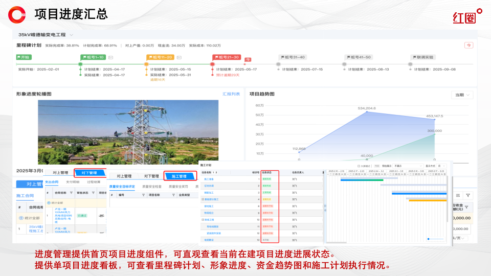 通過紅圈系統(tǒng)的施工現(xiàn)場管理模塊,完整錄入現(xiàn)場所有勞務人員信息,同時,工程的形象進度管理,方便日后回溯,可隨時了解現(xiàn)場進展,方便及時匯報,提供現(xiàn)場依據(jù)。