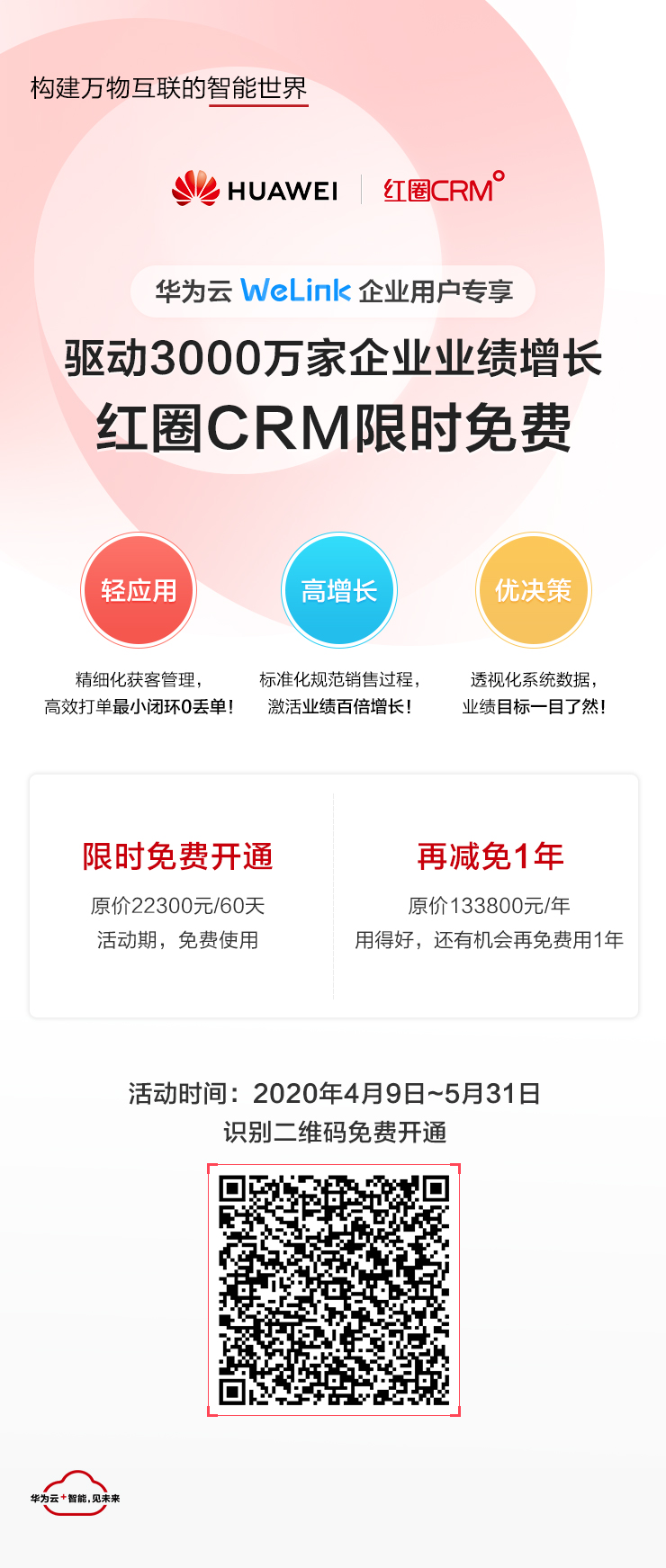 驅(qū)動3000萬家企業(yè)業(yè)績百倍增長——紅圈CRM限時免費,#華為云WeLink#企業(yè)用戶專享,更有驚喜0元購活動。