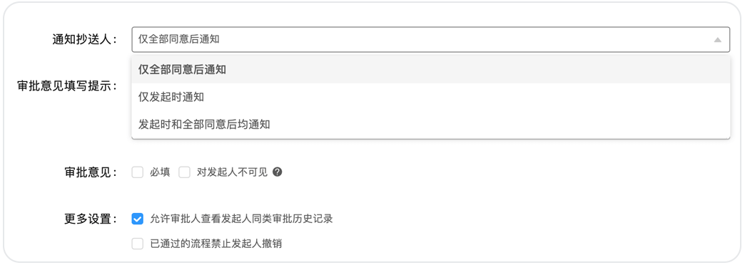 小王的出差報銷最終通過了,這時還需要抄送給辦公室的行政同事以便日后進行成本分析。過去,報銷審批一經發起就抄送給了行政同事,但有些審批后期撤銷了但沒有通知行政同事,造成后期分析時數據存在誤差,現在可以通過設置“僅全部同意后通知”的抄送模式來避免這一問題。抄送共有3種模式,企業可根據實際場景靈活選擇。