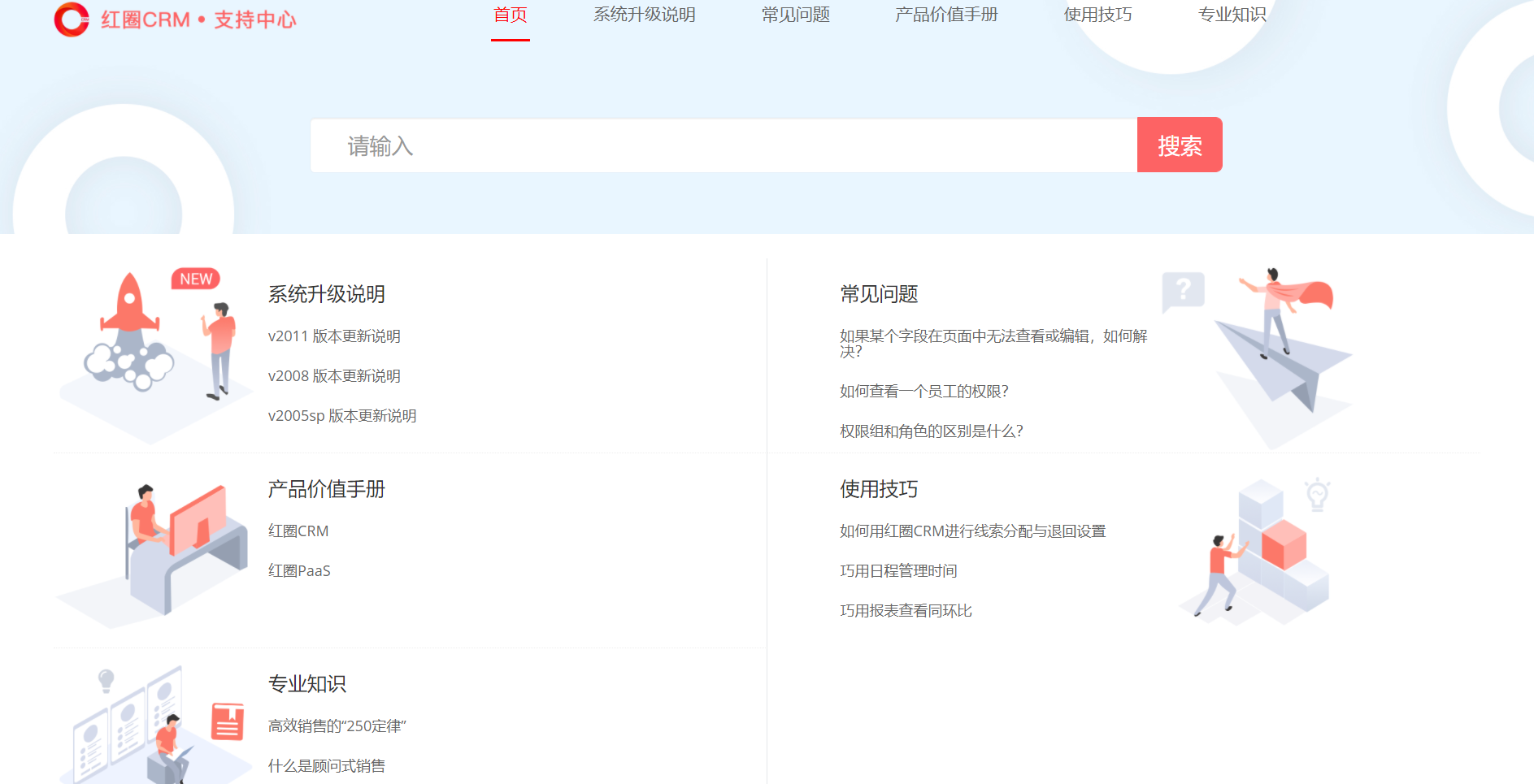 新版本增加了支持中心,包含版本更新說明、產(chǎn)品價(jià)值手冊(cè)、常見問題、使用技巧、專業(yè)知識(shí)。支持中心可以幫助用戶在使用紅圈 CRM 的時(shí)候?qū)λ懈钊氲牧私?。如果用戶?duì)產(chǎn)品有任何建議和意見,也可以通過意見反饋提交給我們。