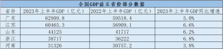 今年上半年,一直斷層式領先的廣東和江蘇也有新亮點。其中,廣東(620909.8億元)繼續位居第一經濟大省,其GDP與第二名的江蘇(60465.3億元)雙雙突破6萬億元,分別領先第三名山東18784.8億元和16340.3億元。數據顯示,廣東GDP同比增長5.0%,雖然低于全國同期0.5個百分點,但GDP總量占到了全國的10.6%。如今,廣東GDP總量已經連續34年位居全國第一。江蘇今年上半年GDP增長6.6%,比一季度加快1.9個百分點,連續4個季度回升,體現出生產平穩、內需改善、質效提升、信心回暖的特征。山東表現也不俗,同比增長6.2%,高于全國0.7個百分點。排名第四的浙江上半年增速亮眼。據浙江省統計局消息,上半年浙江全省生產總值38717億元,同比增長6.8%,為GDP總量前五省份中增速最快的省份。浙江省統計局總統計師王美福表示,浙江上半年經濟增長修復加快主要動力來自于服務業。上半年,服務業增加值增長8.4%,比全國高出2個百分點。服務業對經濟增長的貢獻率達到了69.6%,貢獻最大。