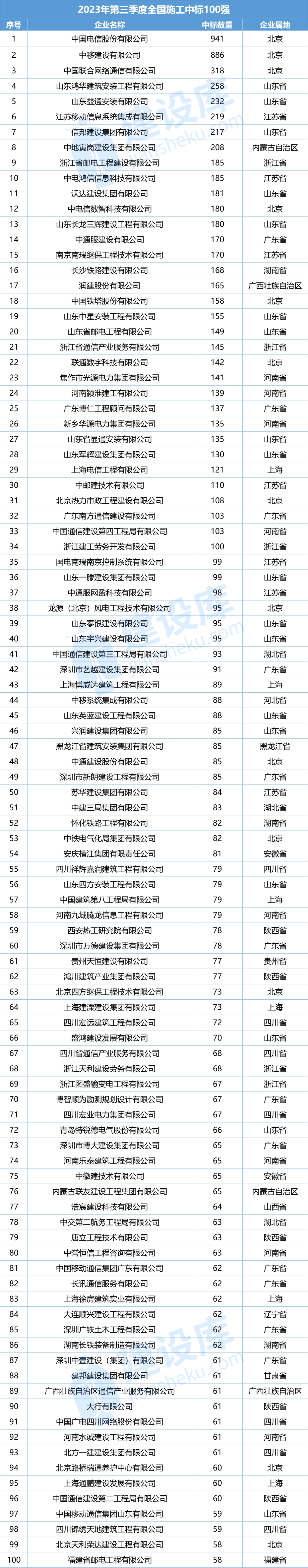 以下是建設庫大數據研究院統計的2023年第三季度全國施工中標100強名單,快來看看你們的企業排名~