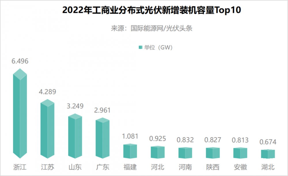 根據(jù)國(guó)家能源局?jǐn)?shù)據(jù),2022年分布式新增裝機(jī)容量排名前三的省份分別是河南省(7.75GW)、山東省(7.51GW)、浙江省(6.61GW)。其中,工商業(yè)分布式新增裝機(jī)容量排名前三的省份分別是浙江(6.496GW)、江蘇(4.289GW)、山東(3.249GW)。