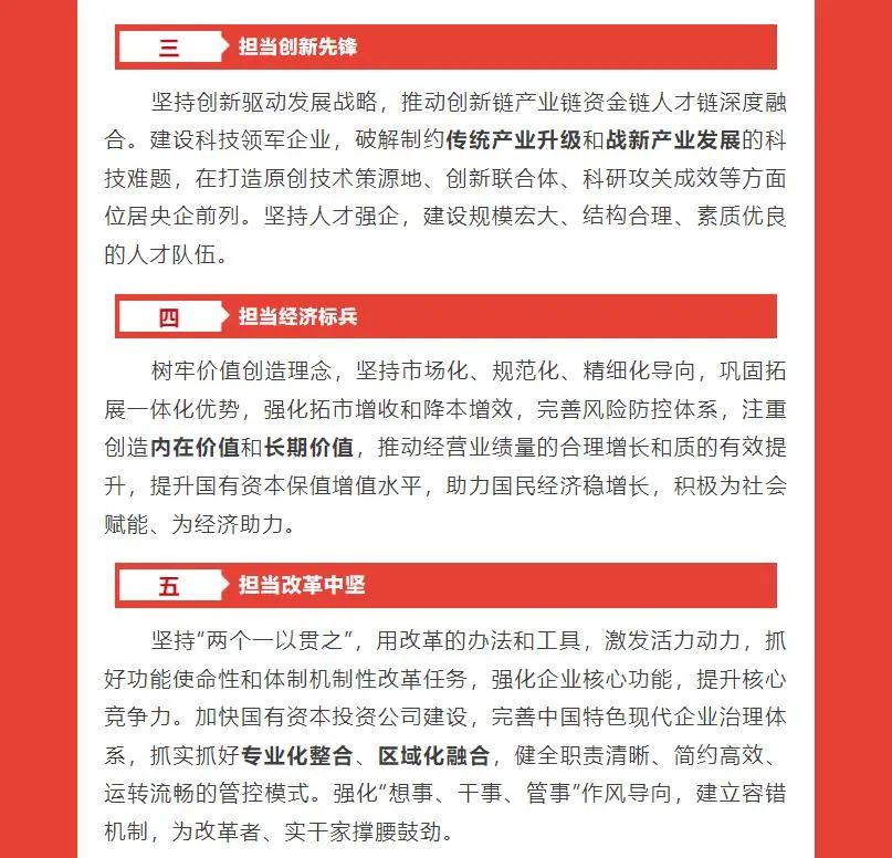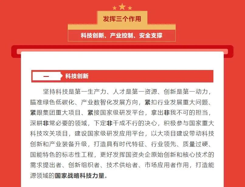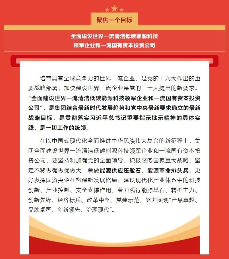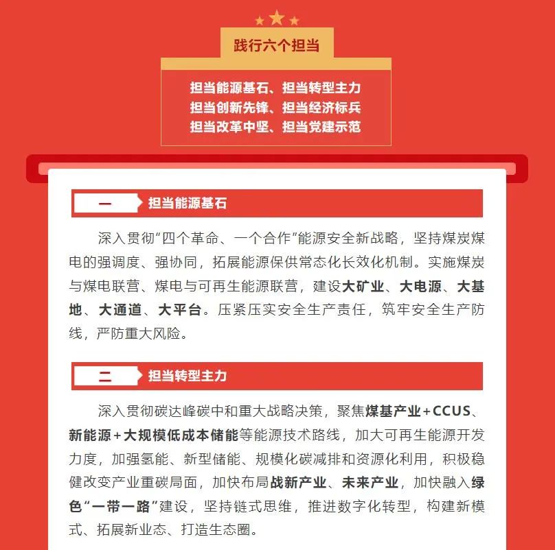 國家能源集團(tuán)最新確立了“一個(gè)目標(biāo)、三個(gè)作用、六個(gè)擔(dān)當(dāng)”發(fā)展戰(zhàn)略。一個(gè)目標(biāo)是指“全面建設(shè)世界一流清潔低碳能源科技領(lǐng)軍企業(yè)和一流國有資本投資公司”,三個(gè)作用是指發(fā)揮科技創(chuàng)新、產(chǎn)業(yè)控制、安全支撐作用,六個(gè)擔(dān)當(dāng)是指擔(dān)當(dāng)能源基石、擔(dān)當(dāng)轉(zhuǎn)型主力、擔(dān)當(dāng)創(chuàng)新先鋒、擔(dān)當(dāng)經(jīng)濟(jì)標(biāo)兵、擔(dān)當(dāng)改革中堅(jiān)、擔(dān)當(dāng)黨建示范。