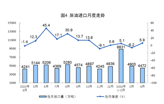 原油生產(chǎn)平穩(wěn)增長,進(jìn)口由降轉(zhuǎn)增。4月份,規(guī)上工業(yè)原油產(chǎn)量1747萬噸,同比增長1.3%,增速比3月份加快0.1個百分點;日均產(chǎn)量58.2萬噸。進(jìn)口原油4472萬噸,同比增長5.9%。