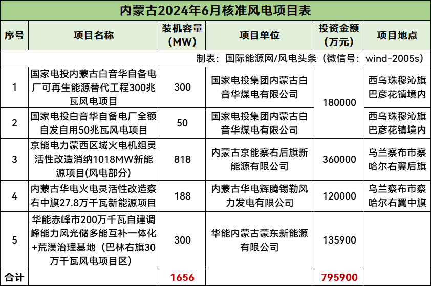內蒙古核準5個風電項目,總規模1656MW,總投資795900萬元,均為陸上風電項目。