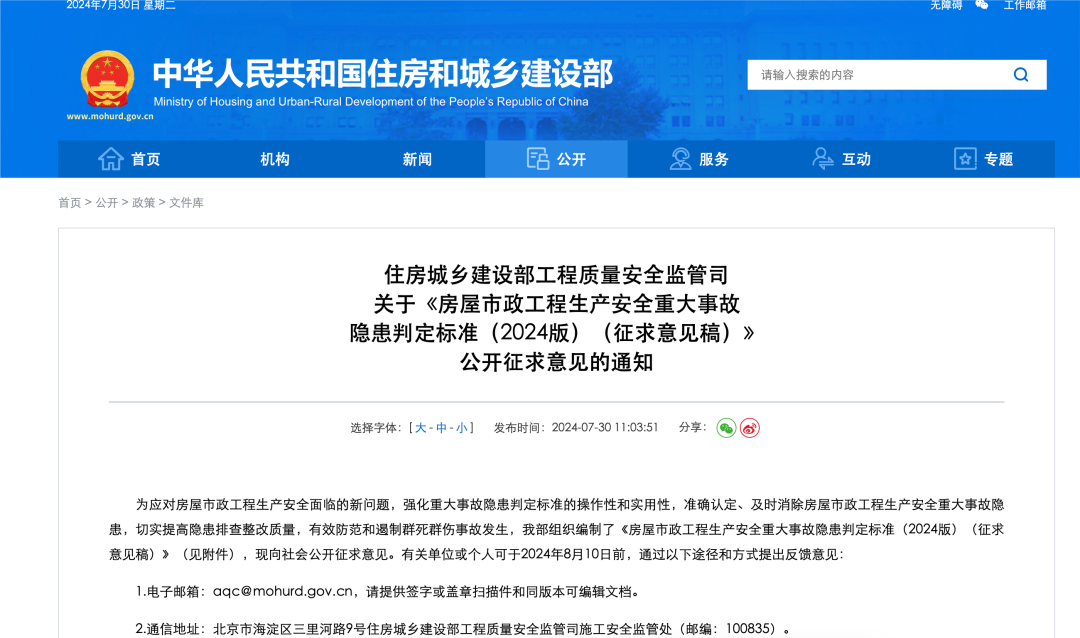 為應對房屋市政工程生產安全面臨的新問題,強化重大事故隱患判定標準的操作性和實用性,準確認定、及時消除房屋市政工程生產安全重大事故隱患,切實提高隱患排查整改質量,有效防范和遏制群死群傷事故發生,我部組織編制了《房屋市政工程生產安全重大事故隱患判定標準(2024版)(征求意見稿)》(見附件),現向社會公開征求意見。有關單位或個人可于2024年8月10日前,通過以下途徑和方式提出反饋意見: