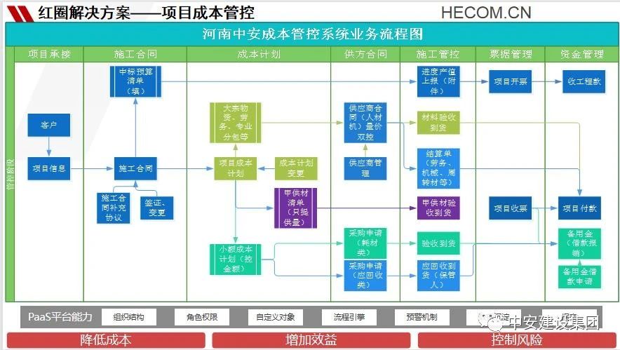 在集團(tuán)公司領(lǐng)導(dǎo)班子的指導(dǎo)下,成本管理中心制定了詳細(xì)的工作方案,設(shè)計(jì)了60余張成本數(shù)據(jù)表格。而紅圈專業(yè)實(shí)施老師也進(jìn)行了兩次系統(tǒng)調(diào)研,用兩周時(shí)間將60余張報(bào)表拆解合并成30余個(gè)業(yè)務(wù)管控點(diǎn),并結(jié)合管控業(yè)務(wù)流程圖進(jìn)行功能匹配,設(shè)計(jì)了《中安集團(tuán)成本管控系統(tǒng)實(shí)施計(jì)劃表》,涵蓋了往來單位管理、施工合同管理、成本核算管理、成本合同管理、成本結(jié)算管理、項(xiàng)目資金收支管理等項(xiàng)目核心業(yè)務(wù),并且細(xì)化了成本管理流程中各個(gè)系統(tǒng)責(zé)任人的工作職責(zé)。